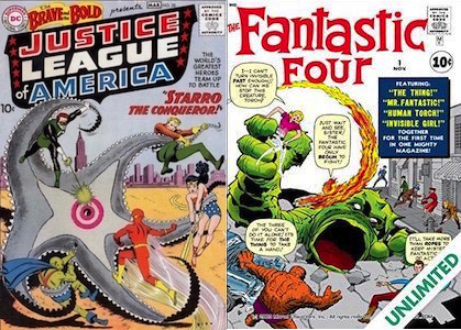 A look at the cover of the first Justice League comic and a look at the cover of the first Fantastic Four comics show the glaring similarities. Both groups are not only fighting a giant monster but they are positioned around the monsters in similar fashions. Coincidence? Not bloody likely.
