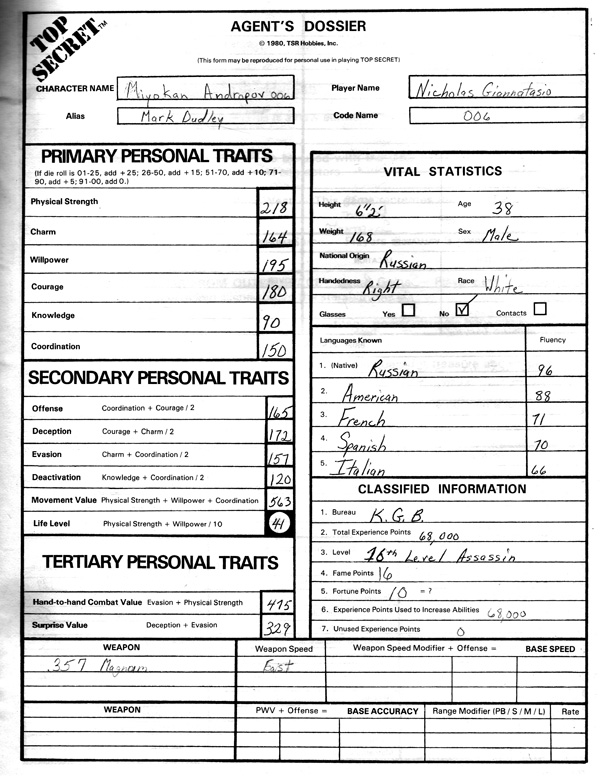 The Beard and I have been friends for a very long time. When you’re friends, you visit each other’s houses frequently. We had long gotten passed the awkwardness of talking to each other’s parents, and had actually engaged our parents, extended families, and friends in conversations and games. On this day, my brother (Marc) and I, were in the basement with Junior (the Beard) and Abba (his brother). This was a constant for us. Either we were in their basement or they were in ours. Our bedrooms were all in our respective basements. The conversation turned to role playing games. Junior said that he had bought a gaming module called Top Secret and he wanted to have a group of friends to learn how to play together. Since the Beard has often fantasized about being a spy, he said that he wanted someone else to create the campaign. Having no such designs on the genre, I offered to learn the game and GM (Game Master). The GM is the person that develops a fully realized story that the players can visualize.