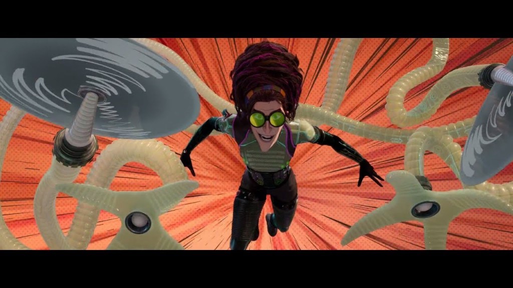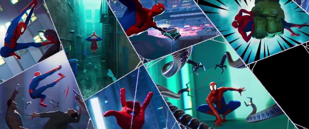 The animated movie begins with big pixels of color, bleeding together with frenetic and loud video game sounds, vivid animation interrupted by a quick exposition of the Spider-man mythos that most everyone finds familiar. My first thought was that this was just inserted as an ancillary prologue, but that is not the case. That bit of exposition is a very important touchstone that is repeated throughout the movie as a necessary framing device. I will explain in due course. Suffice it to say that the framing device becomes important as the story moves along.