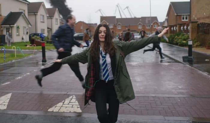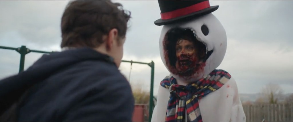 The following morning, Anna and John leave their respective homes completely oblivious to the apocalypse that is transpiring around them. When they encounter a fallen man dressed in a snowman costume, Anna attempts to revive him. As a first aid provider she feels responsible to help, and informs him of this just before she turns him over. When she does turn him over, we can see that he his mouth is covered in gore, as if he has been consuming human flesh. John and Anna try to fight him off, until his eventual demise. Instead of going to the school or home, they find themselves going to the bowling alley where they work. They find Steph and Chris there and help them fight off several interior threats. Steph finds out via social media that the following day there will be a military evacuation of the school. They resolve to go to the school, finding allies and challenges along the way.