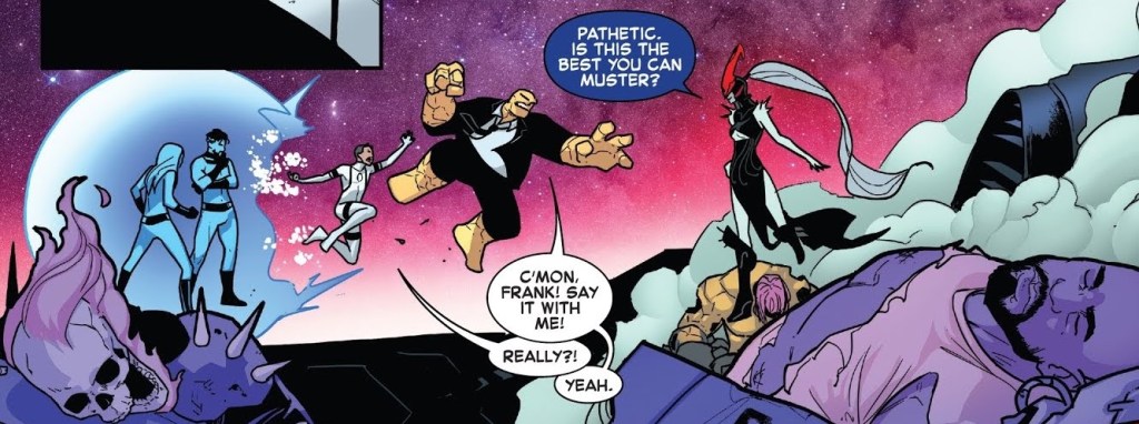 The former members of The Fantastic Four leap into action against the Griever while Reed Richards, Sue Richards, Johnny Storm, and Ben Grimm finally get to hug. And Ben and Johnny see Franklin and Valeria who are five years older (time passes faster in the multiverse). The FF plus two then join the fight. The Griever is finally defeated by Reed tricking her – which anyone who has ever read THE FANTASTIC FOUR knows this is what he does. He outsmarts his enemies. The story ends with our favorite foursome – and the two kids – back together again! Awww!