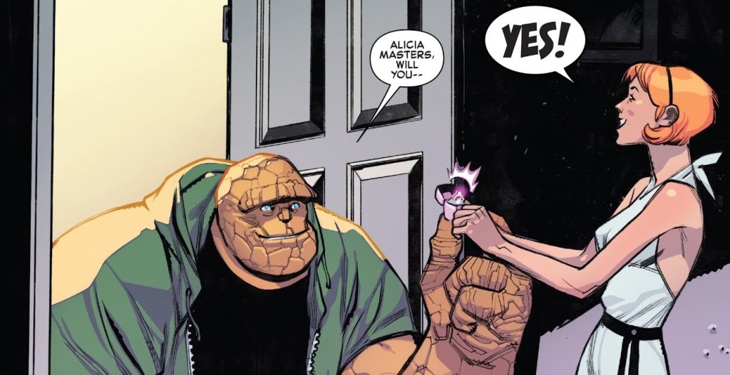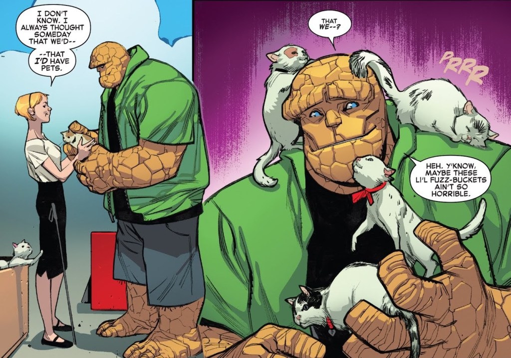 This is a story within a story. Reed Richards (Mister Fantastic) and Sue Richards (The Invisible Woman), along with all the kids from the Future Foundation, are presumed dead. Ben Grimm (The Thing) has made peace with this and he and Alicia get kittens together. But Johnny Storm (The Human Torch) has not moved on and still believes his family is alive. Ben tells his friend Shecky a story about a time the FF were lost in space and Johnny’s singing voice actually got them home.
