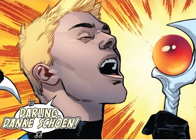 Okay I’ll admit I’m an old Fantastic Four fan going back to the days of issue number one. Just the fact they are back gets a big thumbs up from me. On top of that I love the artwork, I love the characterization, and I love the tongue and cheek approach. Oh My God! Those damn kittens are so cute!!! You have got to see Johnny Storm singing DANKE SHOEN. You have got to see Ben Grimm on one knee proposing to Alicia. You have also got to see Johnny crying over the loss of his family. Okay, I’ll admit I shed a tear as well. This comic was freakin’ AWESOME!!!