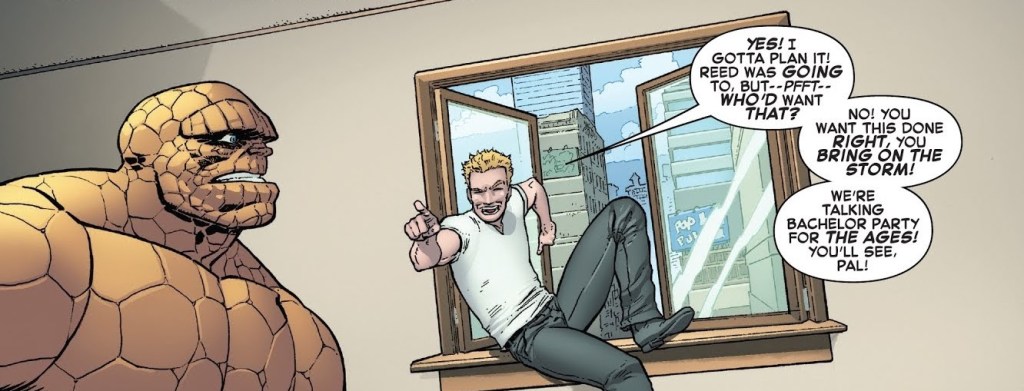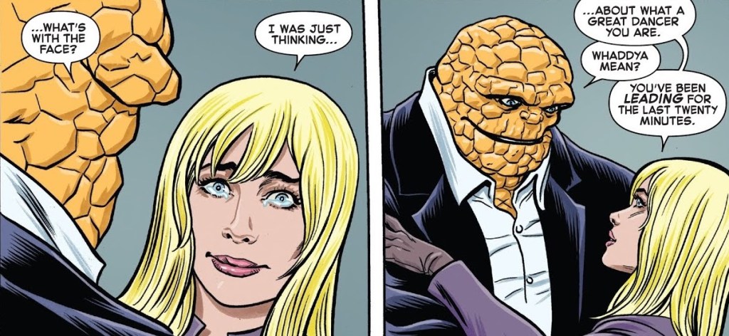 Sue Richards tries to help Ben learn to dance for his wedding. In the process we’re treated to a flashback on how it all started. The interesting thing is while the origin is what we knew we’re treated to new aspects of the four’s relationships and the dynamics they had before they became the FF.