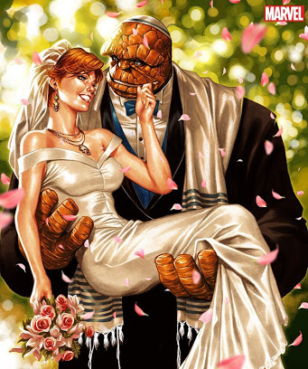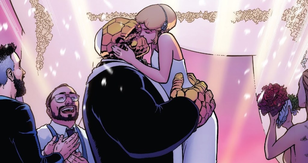 It’s the wedding day and the FF fly down to Arizona. That’s where Ben’s uncle and aunt live and that is where they are getting married. This whole time Ben has been demanding there be no super-hero shenanigans at his wedding. That was why he didn’t invite any super-heroes. But he forgot to tell Doctor Doom. The good doctor crashes the ceremony by broadcasting a message in the sky to everyone on the planet letting them know that Galactus is on the way but he has it taken care of and he wants NO ONE to interfere. So of course the FF is going to fly to Latveria and interfere. But not before Ben and Alicia get married. And they do! And I cried!
