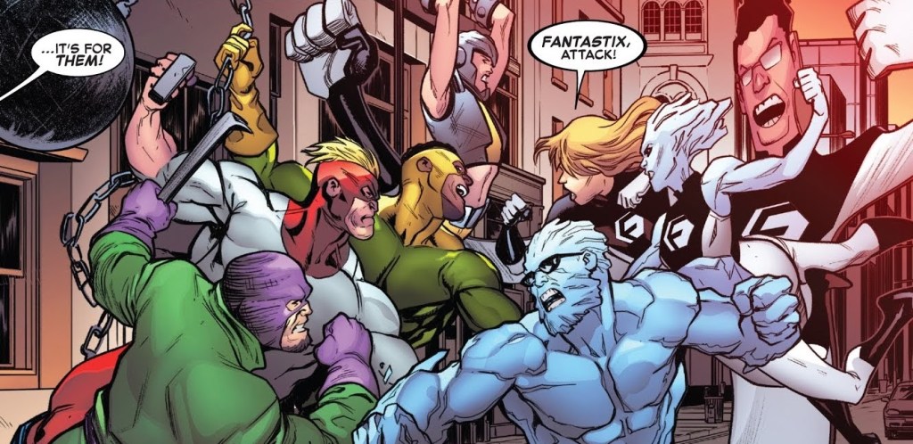 The Fantastic Four family are reunited and headed back to Earth. But things ain’t the way they used to be. The Wrecking Crew attempts to rob a store right across the street from the Baxter Building – something no one has ever done before. Because the Baxter Building was the home of The Fantastic Four. But it isn’t anymore and the Wrecking crew is counting on that. However, although the FF no longer live in the Baxter Building it has become the headquarters to a new group – The Fantastix.