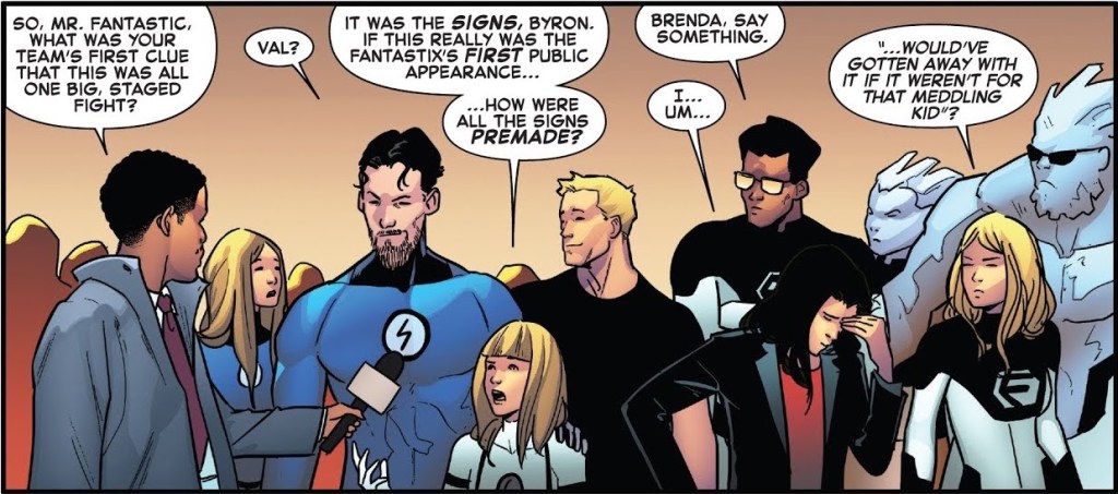 When the FF finally arrive back on Earth, Ben takes off for home while the rest head for the Baxter Building where they arrive in time to see the Fantastix take on the Wrecking Crew – complete with screaming fans holding up signs, media covering the event, and a public relations person talking up a storm and trying to make the FF look bad. Valeria Richards – she of the superhuman intelligence – figures out the whole thing was staged as a publicity stunt by the Fantastix’s PR person – who by the way gets fired.