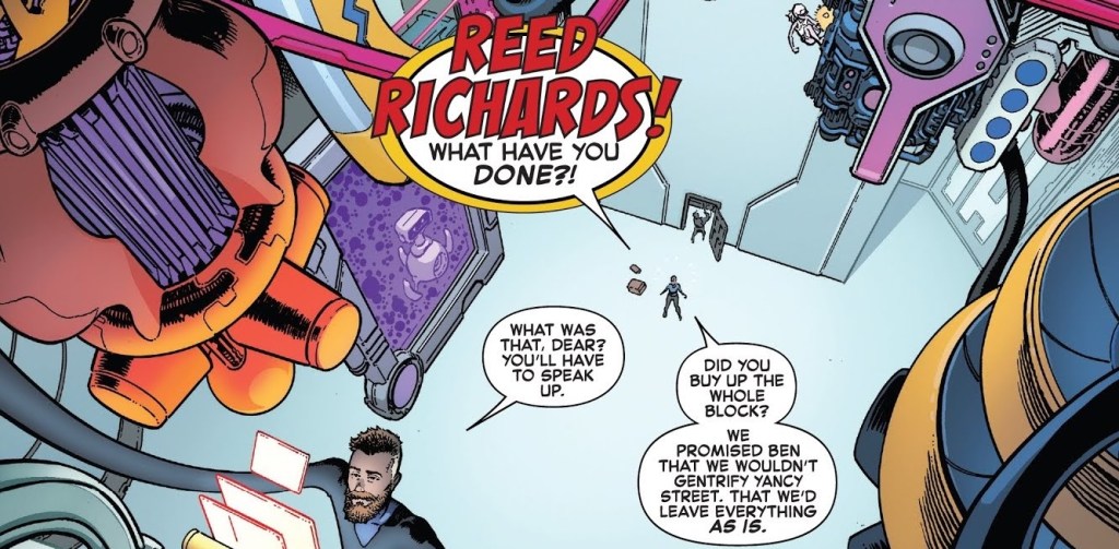 The FF moves into their new digs and Reed – being Reed – just can’t leave things alone. There was some concern over room so he and Valeria borrowed from Doctor Who, folded in some dimensions, and their building is now bigger on the inside than in the outside.