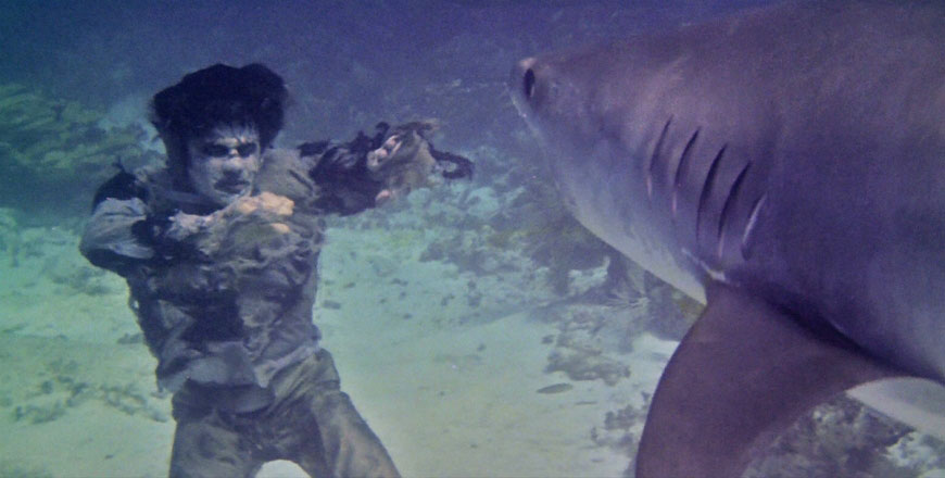 Another key scene shows a fight between a zombie vs. a shark underwater that is not CGI, Ladies and Gentlemen. There is an actual shark wrangler fighting with his shark and one of them gets hurt, for real. This movie has been cut and re-edited several times because of its excessive graphic scenes. Some of those scenes may look cheesy nowadays, but back then and even still to this day, they made people literally lose their lunch in the theaters.