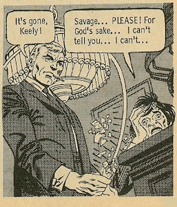 For once Savage is the one getting the snot beat out of him. But he manages to turn the table on Mace and win the day. Savage saved the President and made the world safe for Mom, apple pie, and the flag. As the ambulance leaves with Savage in it one soldier asks another who he is and the reply gives our magazine its name. “His name is . . . Savage!”