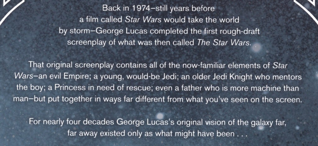 As the story goes, George Lucas wanted to do Flash Gordon, couldn’t get the rights, and so decided to make his own Flash Gordon-type movie. But what he initially came up with and what finally came to us on screen are two different things. His THE STAR WARS became STAR WARS and went through various re-writes and re-imaginings and compromises because we were given A NEW HOPE – the movie we all love.