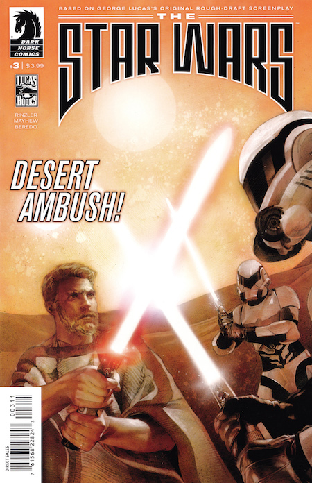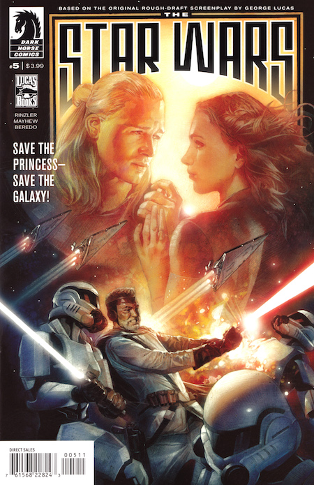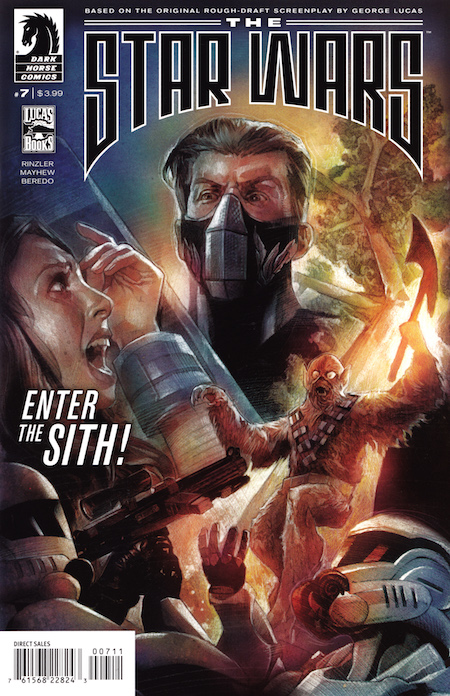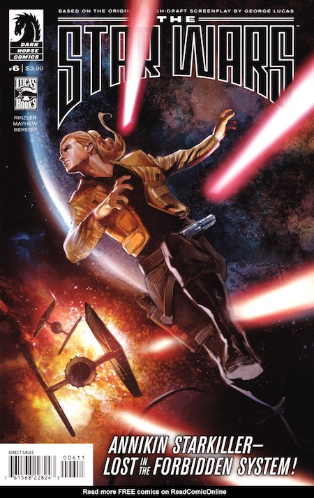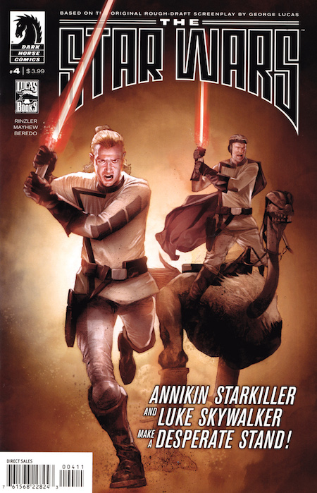 THE STAR WARS is an eight-issue comic book mini-series produced by Dark Horse Comics and published in September 2013. It is based on George Lucas’ original screenplay for STAR WARS in 1974. In it Luke Skywalker is older and already an accomplished Jedi, and the main character is Annikin Starkiller his apprentice. The mini-series was written by Jonathan W. Rinzler and illustrated by Mike Mayhew.