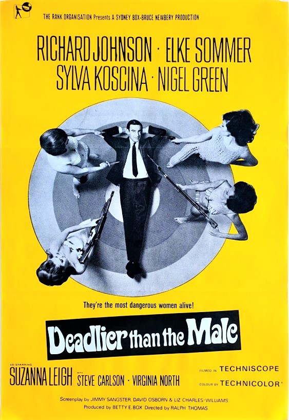 DEADLIER THAN THE MALE (1967) is a British action-adventure mystery movie. It stars Richard Johnson, Elke Sommer, and Nigel Green. It was produced by Betty E. Box, directed by Ralph Thomas, and the screenplay was by Jimmy Sangster, David Osborn, and Liz Charles-Williams from an original story by Jimmy Sangster.